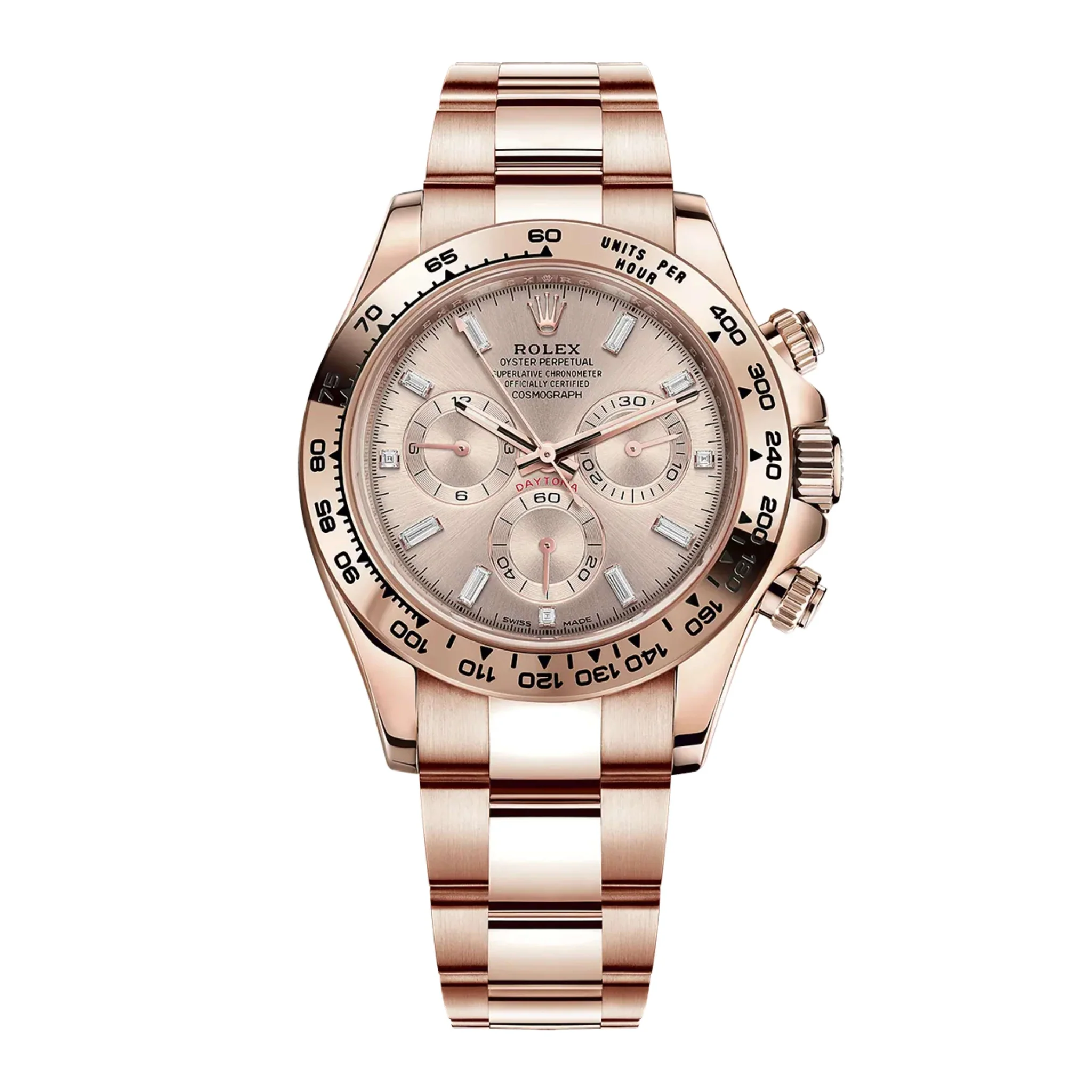 Rolex Cosmograph Daytona 40mm 18k Everose Gold Sport Chronograph watch. Solid, polished finished, 18kt Everose Gold case. The original is equipped with a new sunburst glossy Sundust dial. The sunburst finish creates subtle reflections of light, making this model even more expressive. Superb 8 baguette-cut diamonds act as hour markers. At the same time, smaller diamonds are set at 3, 6, and 9 o’clock positions. The dial has small Sundust counters. Polished Everose Gold hands, hour and minute hands with luminous fill. Fine printed minute/seconds and fractions of a second track. Polished 18kt Everose Gold screw-down crown with Rolex’s patented “Triplock” triple waterproofness system, ensuring that the crown screws down against the Oyster case as securely as a submarine hatch. Screw-down Chrono buttons in polished 18kt Everose Gold. Chronograph/Stopwatch function: large central seconds counter hand, able to measure time up to 1/8th of a second; 30-minute counter sub-dial located at the 3 o’clock position; 12-hour counter sub-dial located at the 9 o’clock position. Continuous running small seconds hand sub-dial located at the 6 o’clock position. A scratch-resistant sapphire crystal protects the dial. Monobloc middle case, screw-down case back. Fixed 18ct Everose Gold bezel with filled engraved tachymeter scale. The movement is mechanical self-winding, Rolex in-house caliber 4130 with 44 jewels and 72 hours of power reserve running the time only or 66 hours with the chronograph function running. The watch is presented on an 18k Everose Gold Oyster bracelet of flat three-piece links with a folding Oysterlock safety clasp with an Easylink 5 mm comfort extension link. The water resistance is up to 100m/330ft. The Watch comes complete with store papers and a Rolex box. Will include 3 years Store Warranty.