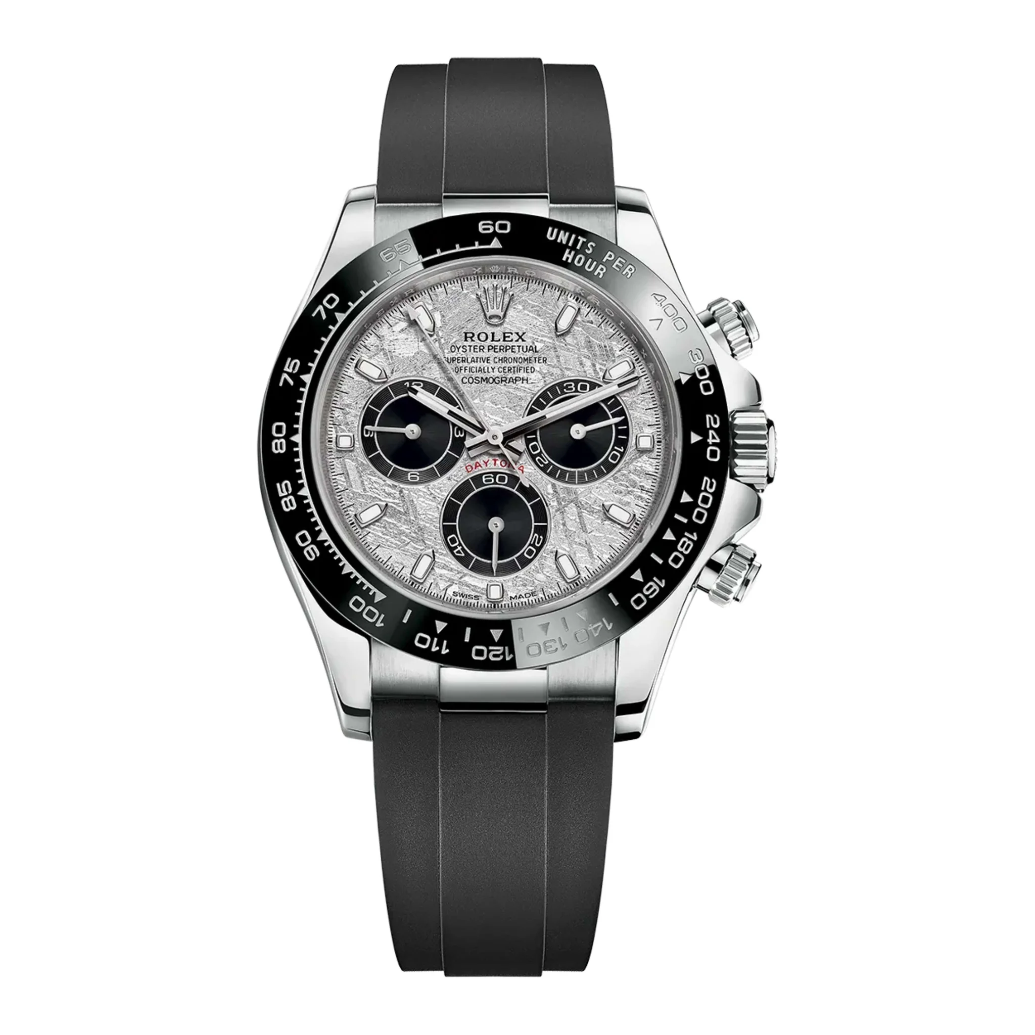 Rolex Cosmograph Daytona 40mm 18k White Gold Sport Chronograph watch. Solid, polished finished, 18kt white gold case with brushed and polished finished center lugs. They have a Meteorite Dial and black sub-dials with polished White Gold hands, hour and minute hands with luminous fill. Applied White Gold rimmed index hour markers with luminous fill. Fine printed minute/seconds and fractions of a second track. Polished 18kt White Gold screw-down crown with Rolex’s patented “Triplock” triple waterproofness system, ensuring that the crown screws down against the Oyster case as securely as a submarine hatch. Screw-down Chrono buttons in polished 18kt White Gold. Chronograph/Stopwatch function: large central seconds counter hand, able to measure time up to 1/8th of a second; 30-minute counter sub-dial located at the 3 o’clock position; 12-hour counter sub-dial located at the 9 o’clock position. Continuous running small seconds hand sub-dial located at the 6 o’clock position. A scratch-resistant sapphire crystal protects the dial. Monobloc middle case, screw-down case back. Fixed Black “Cerachrom” bezel, made of highly durable ceramic that is extremely hard, highly scratch-resistant, has excellent corrosion resistant properties & is unaffected by ultraviolet rays so the color will not fade. White gold filled engraved tachymeter scale on the bezel. The movement is mechanical self-winding, Rolex in-house caliber 4130 with 44 jewels and 72 hours of power reserve running the time only or 66 hours with the chronograph function running. The watch is presented on an Oysterflex bracelet of Flexible metal blades overmoulded with high-performance elastomer with a Folding Oysterlock safety clasp with Easylink 5 mm comfort extension link. The water resistance is up to 100m/330ft.