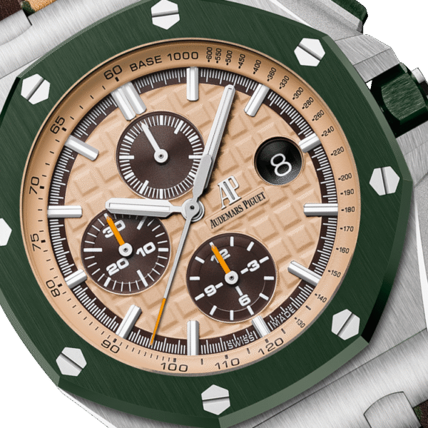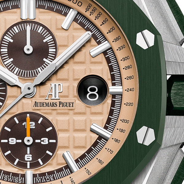 Beige dial with “Méga Tapisserie” pattern, brown counters, brown external zone, white gold applied hour-markers and Royal Oak hands, beige inner bezel.