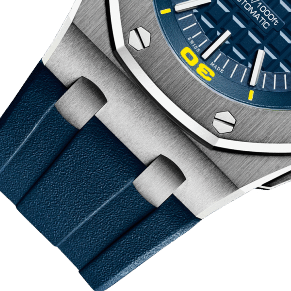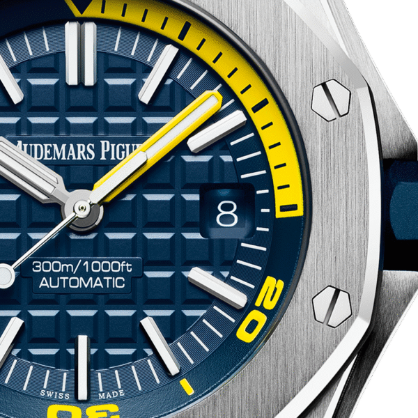 Blue dial with “Méga Tapisserie” pattern, white gold applied hour-markers and Royal Oak hands (yellow minutes hand) with luminescent coating, blue rotating inner bezel with diving scale and zone from 60 to 15 minutes in yellow.