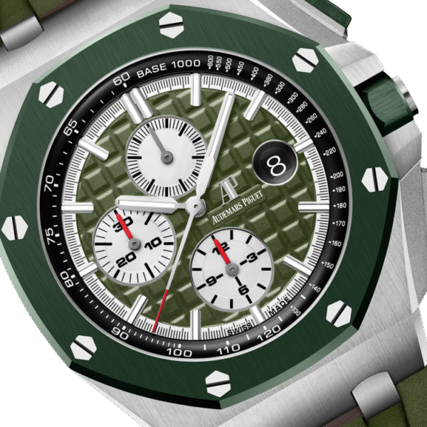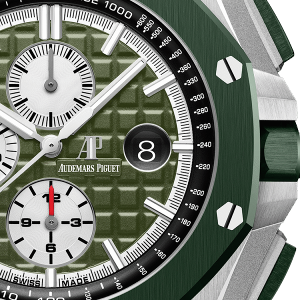 Khaki green dial with “Méga Tapisserie” pattern, rhodium-toned counters, rhodium-toned external zone, white gold applied hour-markers and Royal Oak hands, black inner bezel.