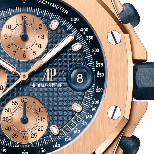 Blue dial with “Petite Tapisserie” pattern, pink gold-toned counters, pink gold applied hour-markers and Royal Oak hands with luminescent coating, blue inner bezel.