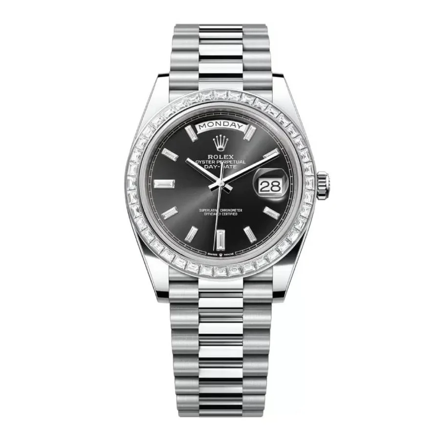 Rolex Perpetual Day-Date 40 Watch of 950 Platinum and diamonds. Black dial set with diamonds. Hour markers are 10 baguette-cut diamonds. Screw-down, Twinlock double waterproofness system. Scratch-resistant sapphire crystal, Cyclops lens over the date. Centre hour, minute, and seconds hands. Instantaneous date with a rapid setting. Stop-seconds for precise time setting. The bezel of 950 Platinum set with 40 baguette-cut diamonds. The Watch comes with Mechanical Self-winding Movement & 3255 Caliber w/ 31 jewels & 70 hours power reserve. The President 950 Platinum bracelet with concealed folding Crownclasp. The Watch is with Rolex Watch box, Rolex Warranty Card. Covered with Rolex Warranty.
