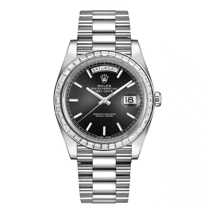 Rolex Perpetual Day-Date 40 Watch of 950 Platinum and diamonds. A black dial with hour markers is a stick. The 950 Platinum set with diamonds bezel. The President bracelet of Platinum, 228396tbr-0024.