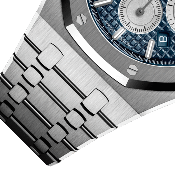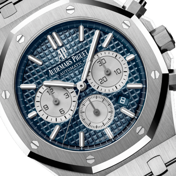 Blue dial with “Grande Tapisserie” pattern, rhodium-toned counters, white gold applied hour-markers and Royal Oak hands with luminescent coating.
