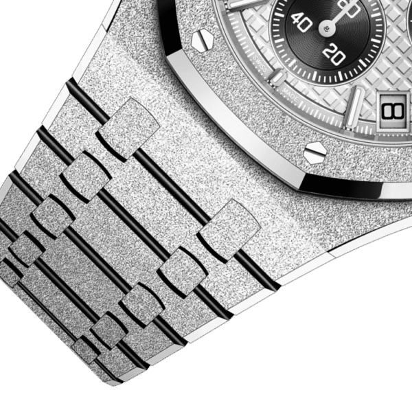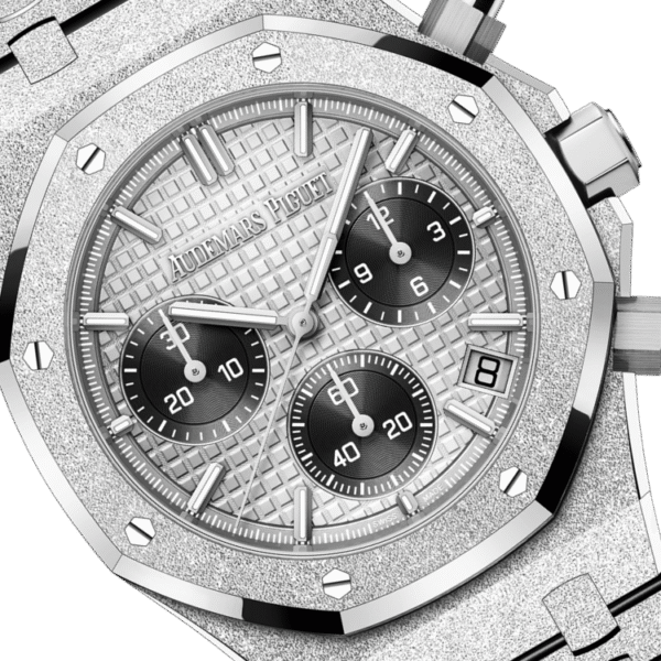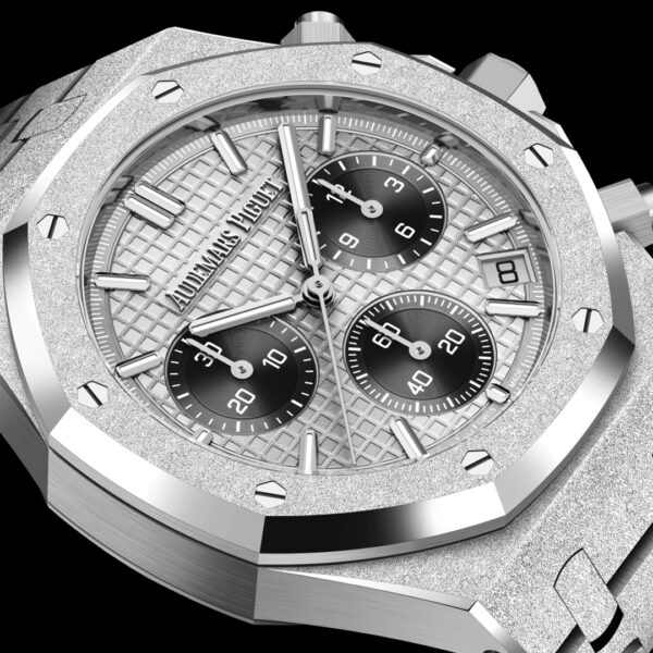 Grey dial with “Grande Tapisserie” pattern, black counters, white gold applied hour-markers and Royal Oak hands with luminescent coating.