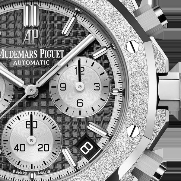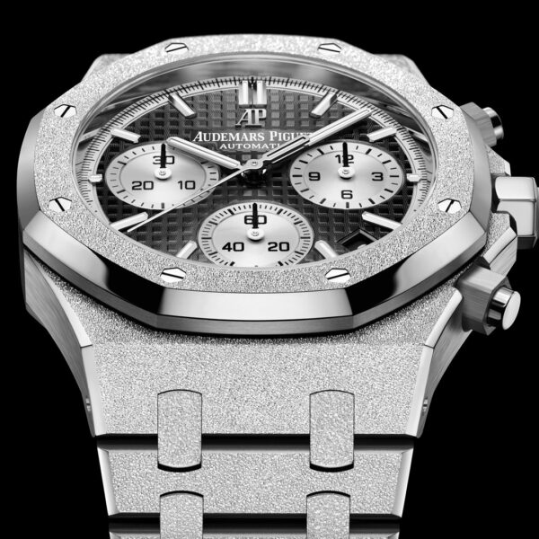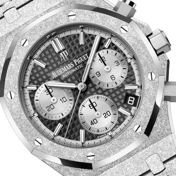 Black dial with “Grande Tapisserie” pattern, rhodium-toned counters, white gold applied hour-markers and Royal Oak hands with luminescent coating.