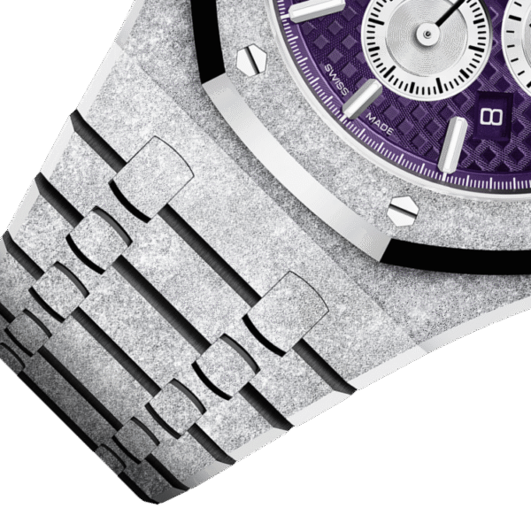 Plum purple dial with “Grande Tapisserie” pattern, rhodium-toned counters, white gold applied hour-markers and Royal Oak hands with luminescent coating.