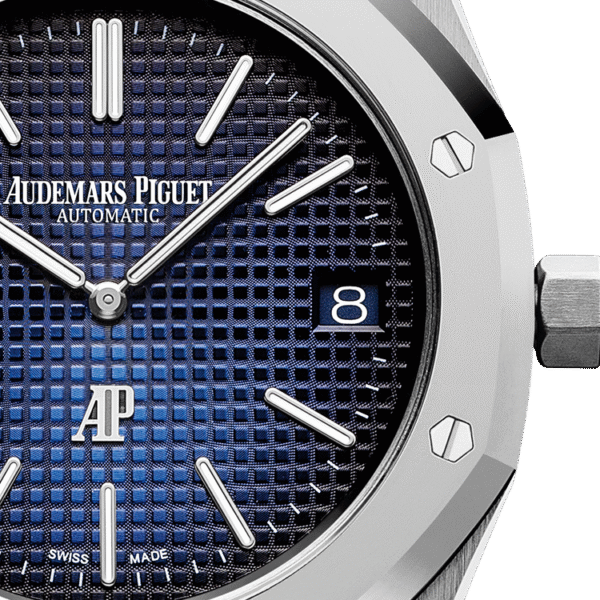 Smoked blue dial with “Petite Tapisserie” pattern, white gold applied hour-markers and Royal Oak hands with luminescent coating.