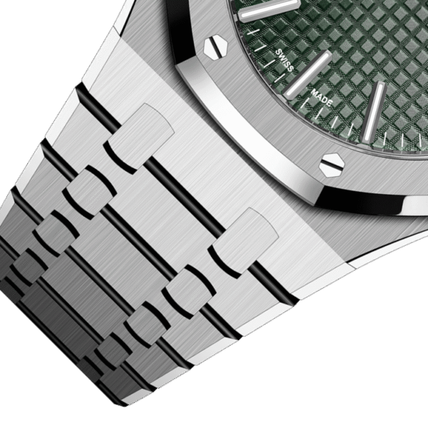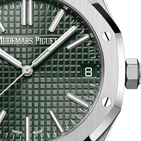 Khaki green dial with “Grande Tapisserie” pattern, white gold applied hour-markers and Royal Oak hands with luminescent coating.