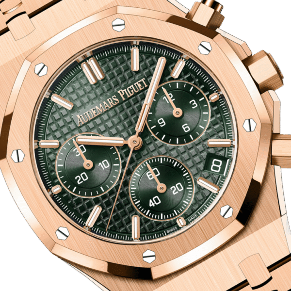 Khaki green dial with “Grande Tapisserie” pattern, khaki green counters, pink gold applied hour-markers and Royal Oak hands with luminescent coating.